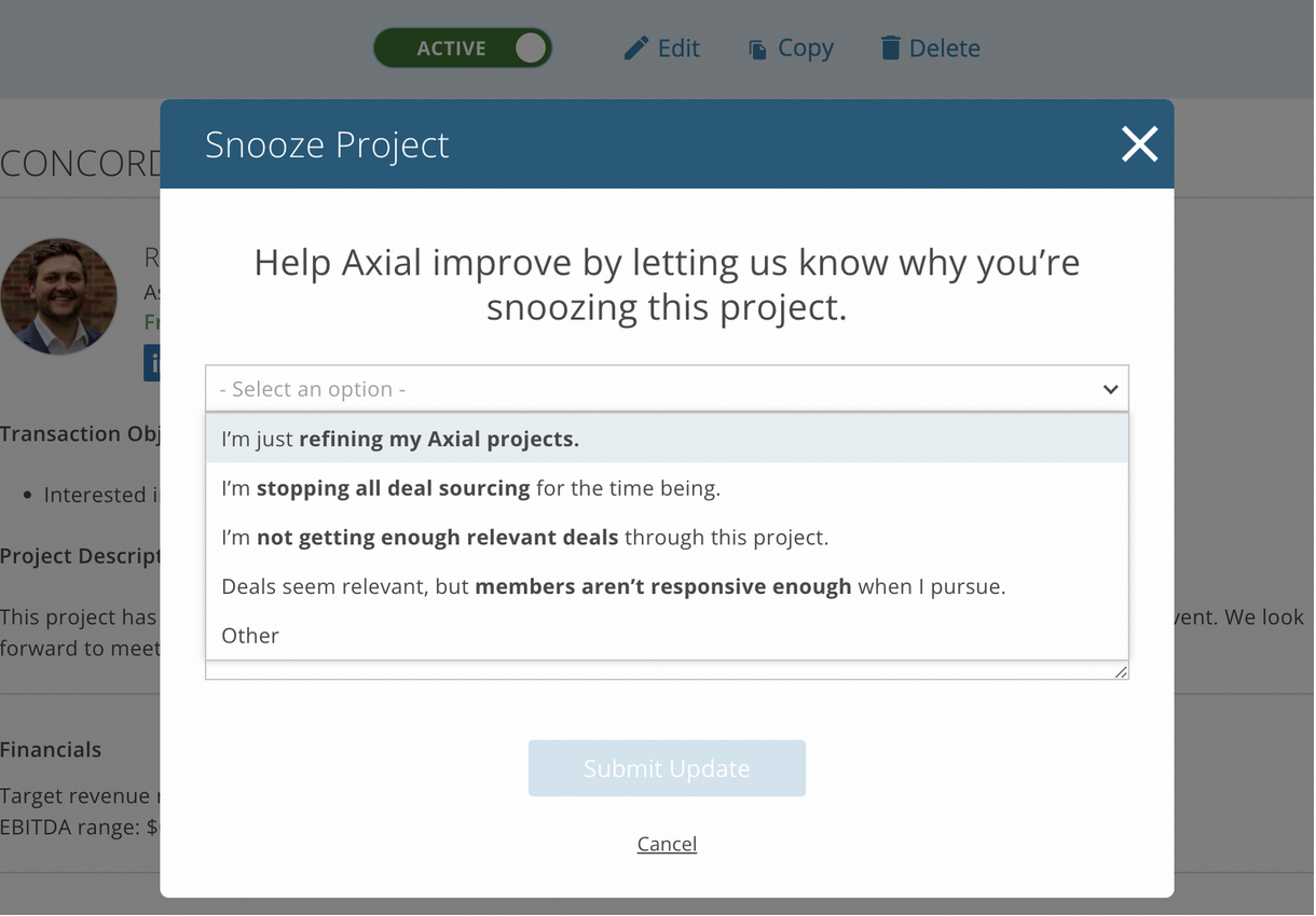 Axial members were churning by deactivating what Axial calls "Buyside Projects"–similar to a saved search, this is the method by which buyers source deals. The company had little-to-no data on drivers of churn and needed to know more.