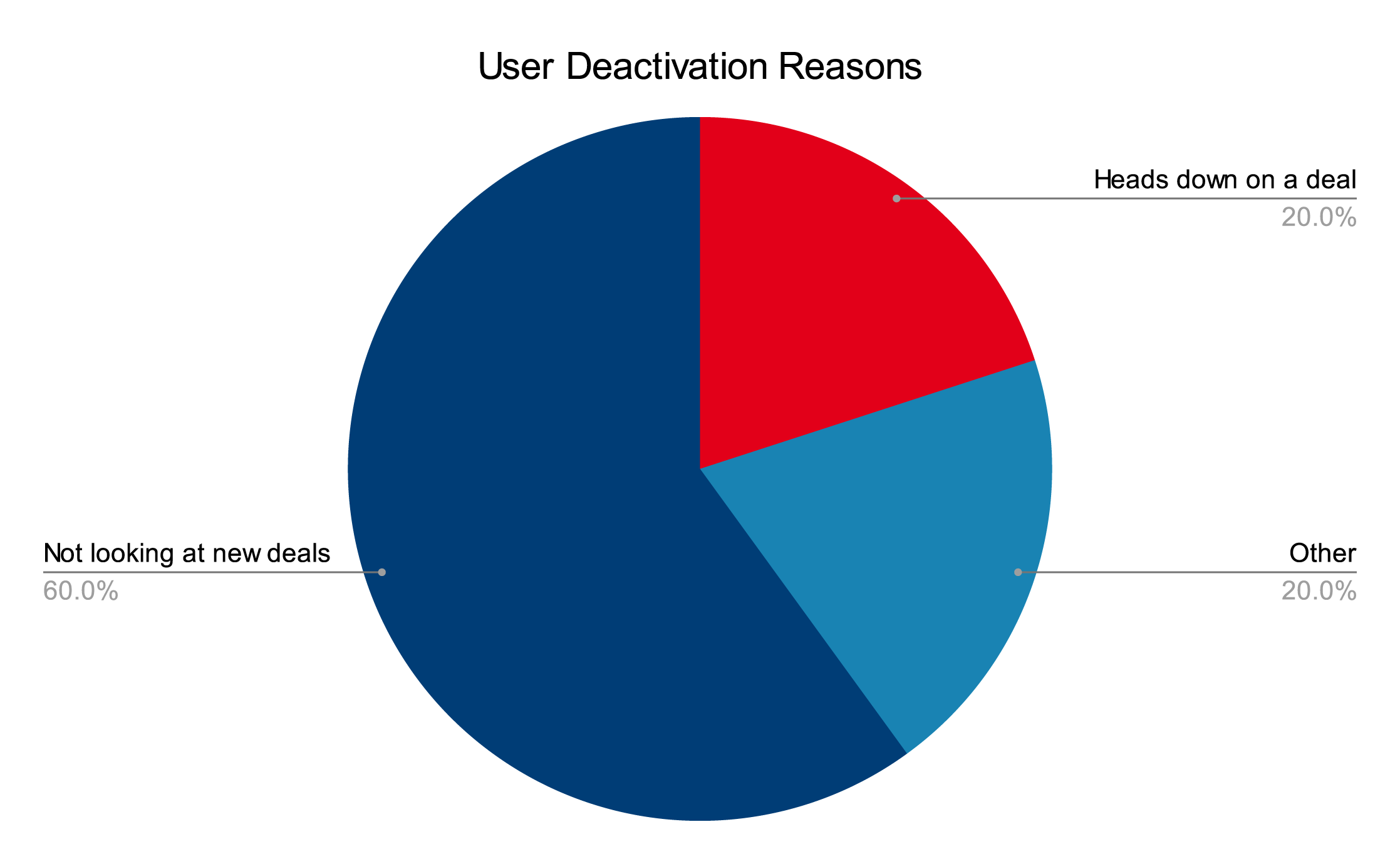 Facing a high volume of member deactivations, Axial lacked crucial data on churn reasons and motivations. Through interviews and surveys I discovered that deactivation often wasn't a sign of dissatisfaction, but rather a natural dormancy period when firms were not focused on sourcing deals. This insight shifted our approach from aggressive reactivation to nurturing dormant members, leading to more effective engagement and a deeper understanding of member motivations. The project highlighted the importance of digging deeper into member behavior to avoid assumptions and build stronger customer relationships.